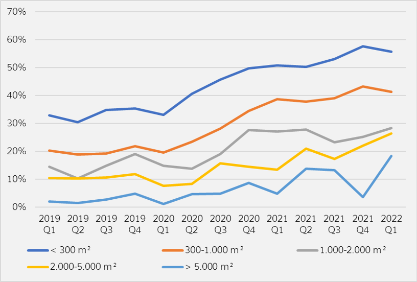 Kleine bedrijfsruimten worden sneller verhuurd of verkocht. Bijna 60% van het nieuw aangemelde aanbod van 300 m² of kleiner is na een kwartaal door de markt opgenomen. Het cijfer voor bedrijfsruimten tussen 300 en 1.000 m² ligt net boven 40%. Bedrijfsruimten met grotere oppervlakten worden juist minder snel door de markt opgenomen. Vaak gaat het bij grotere oppervlakten om specifiekere ruimten en duurt het langer voordat een huur- of koopcontract is afgesloten. Duidelijk is dat we in alle grootteklassen sinds 2020 een flinke toename zien van het nieuw aangemelde aanbod dat na een kwartaal in gebruik is genomen sinds 2020.